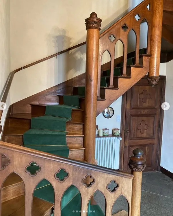 L’escalier en bois ancien a été revalorisé grâce à une moquette verte posée selon les règles de l’art. Des tringles décoratives en laiton ont été installées pour maintenir le tapis en place tout en ajoutant une touche classique et raffinée.