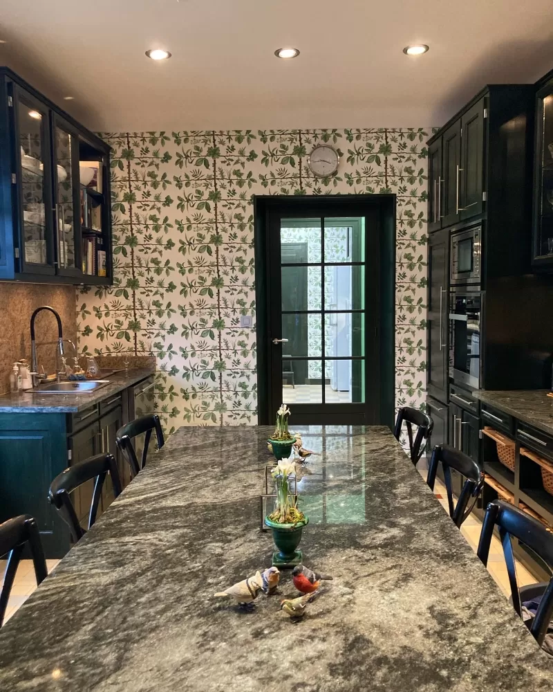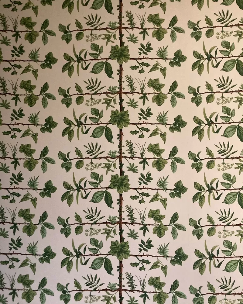 - Alignement des motifs : la pose a été effectuée avec une grande précision pour garantir la continuité des lignes et des formes du papier peint Espalier.